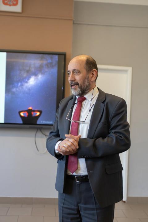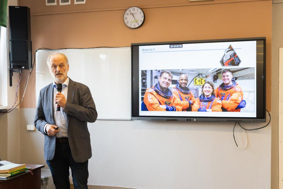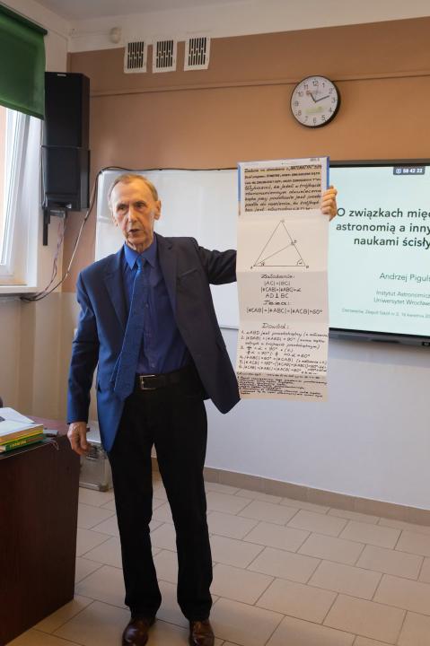 16 kwietnia nasza szkoła uczestniczyła w spotkaniu „O związkach między astronomią a innymi naukami ścisłymi”. Spotkanie poprowadził prof. Andrzej Pigulski z Instytutu Astronomicznego Uniwersytetu Wrocławskiego. Profesor w ciekawy sposób opowiadał, jak astronomia jest mocno powiązana z fizyką, matematyką i chemią, pokazał dużo przykładów, jak te nauki się łączą i jak astronomia korzysta z nich, ale też sama je inspiruje do rozwoju.