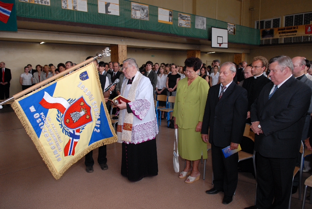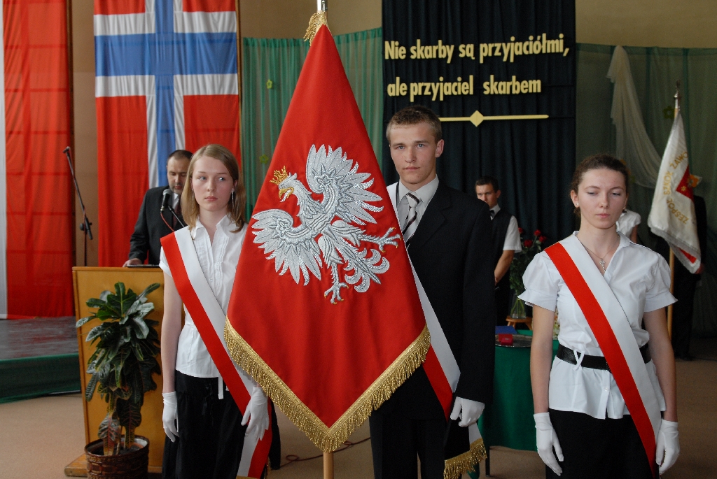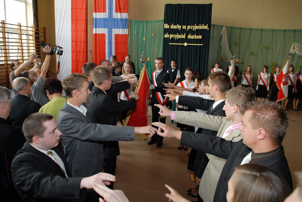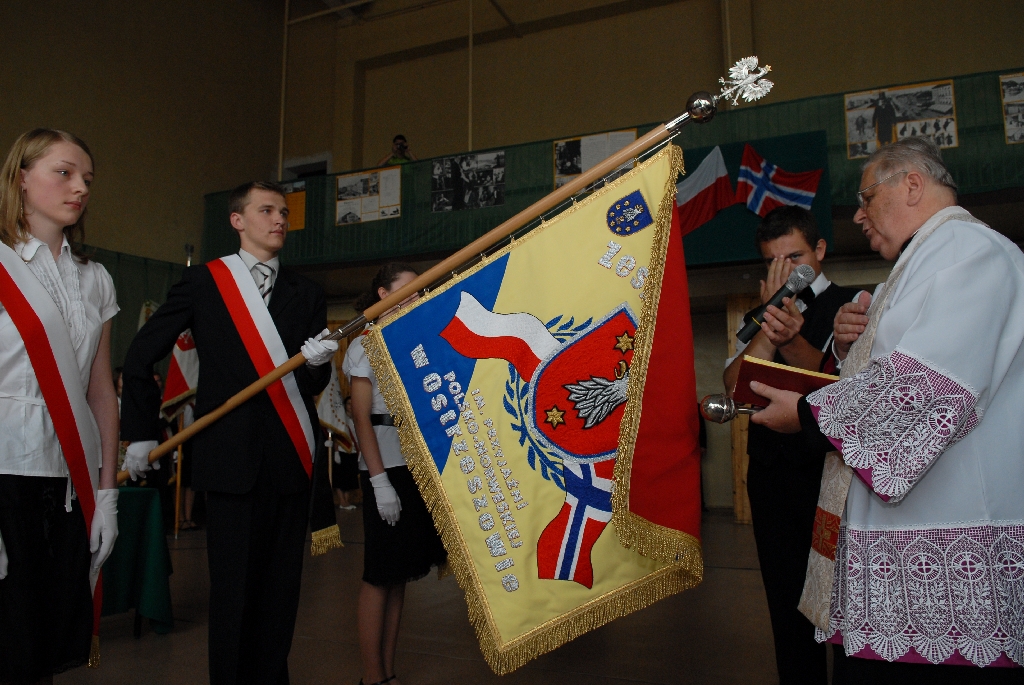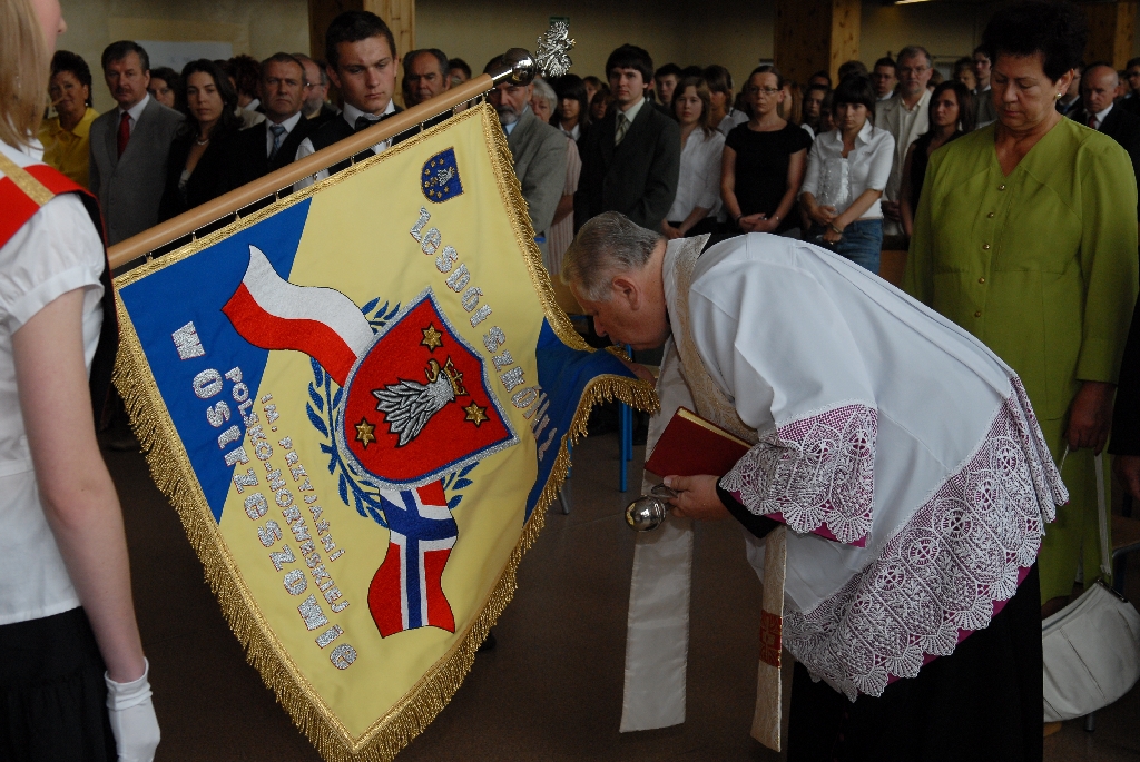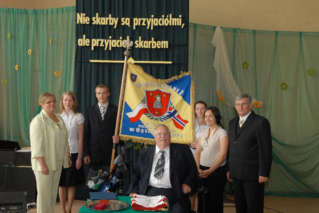 Rozpoczął się dość długi proces wyłaniania kandydatów poszczególnych środowisk tworzących społeczność szkolną. Ostatecznie po długich dyskusjach, w tajnym głosowaniu uczniów i nauczycieli zwyciężył patron-idea - Przyjaźń Polsko-Norweska. Od tej chwili podjęte zostały konkretne przygotowania do nadania szkole imienia w dniu 13 czerwca 2008 roku. Jednocześnie podjęto decyzję o zakupie nowego sztandaru dla szkoły, który miał być symbolem nowego etapu w życiu szkoły. Sztandar to ważny symbol w tradycji szkolnej, dlatego wiele było dyskusji nad jego plastycznym wyrazem. Ostatecznie jego widzialny obraz przedstawia herb miasta Ostrzeszowa wkomponowany w tarczę szkolną, u podstawy której powiewają dwie flagi: Polski i Norwegii, symbolizując przyjaźń obu narodów, tak bardzo obecną w historii naszego miasta. Tło ma barwy powiatowe z herbem powiatu w narożniku, co jest nawiązaniem do faktu, że to właśnie powiat jest organem prowadzącym szkołę.
