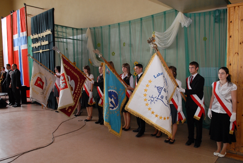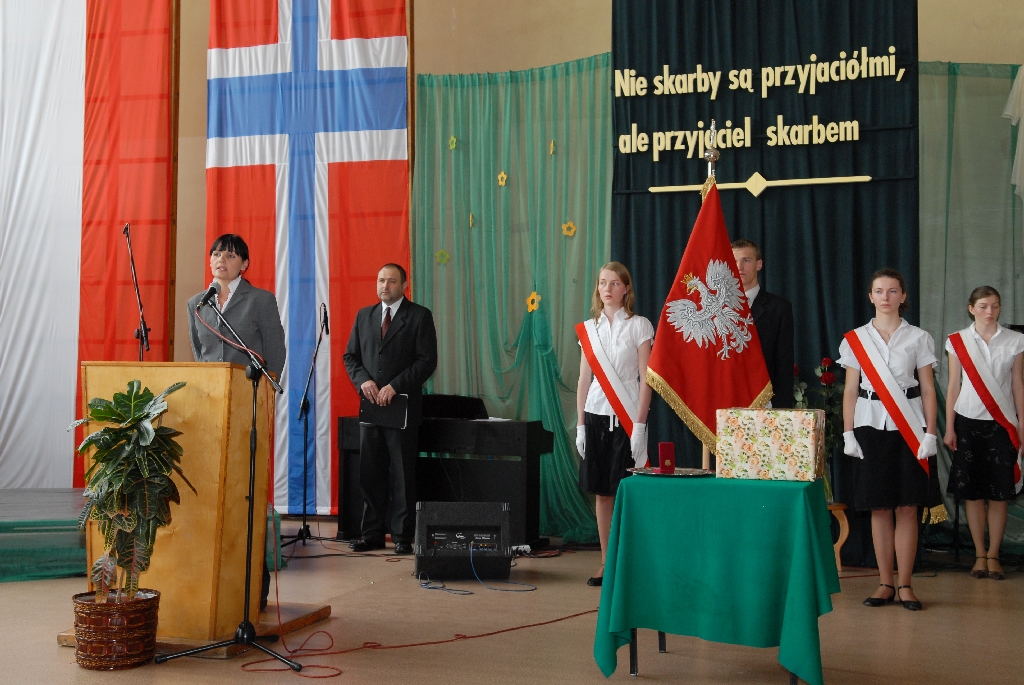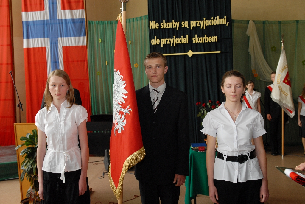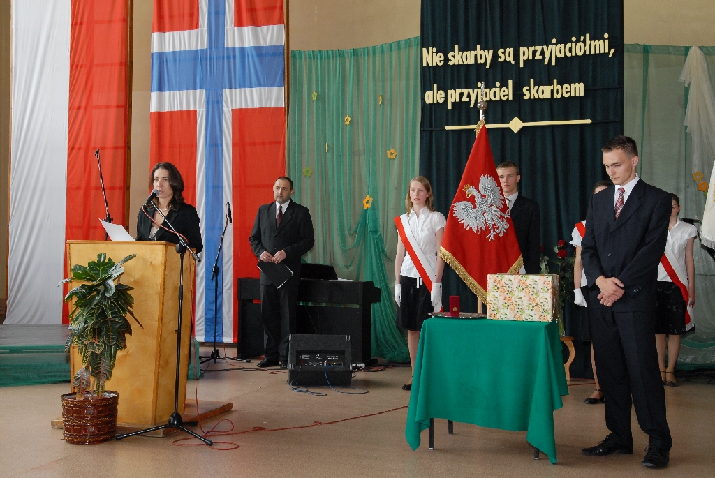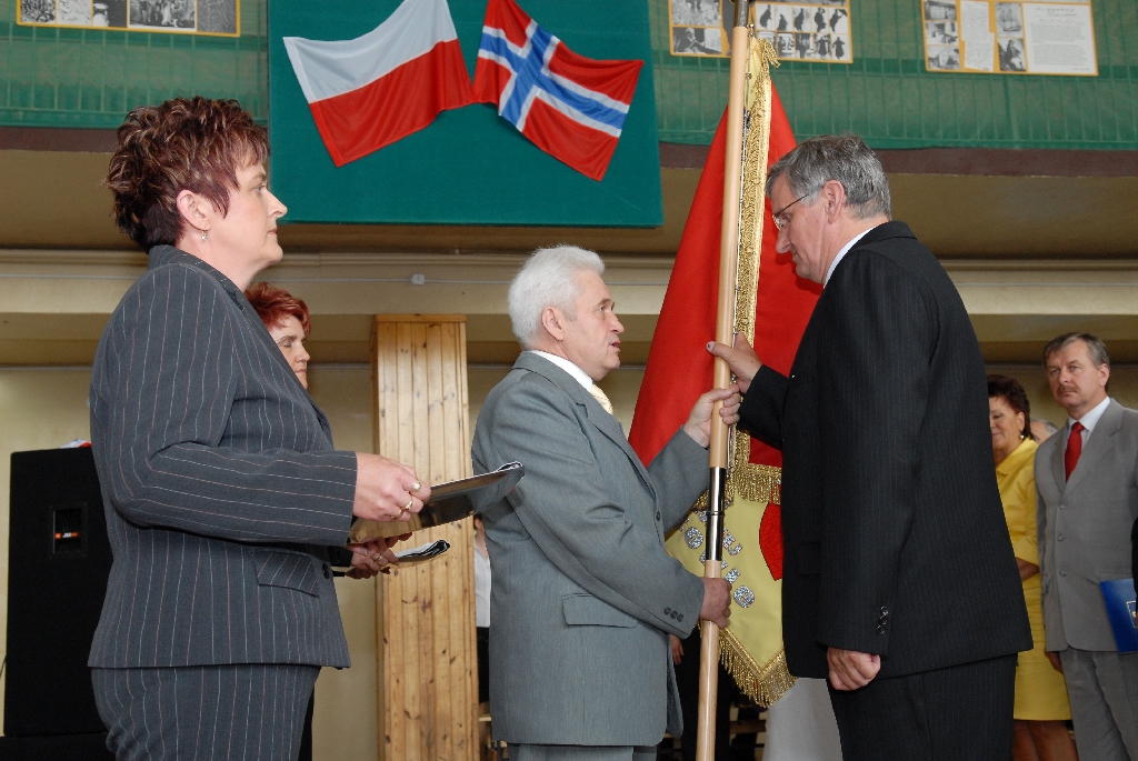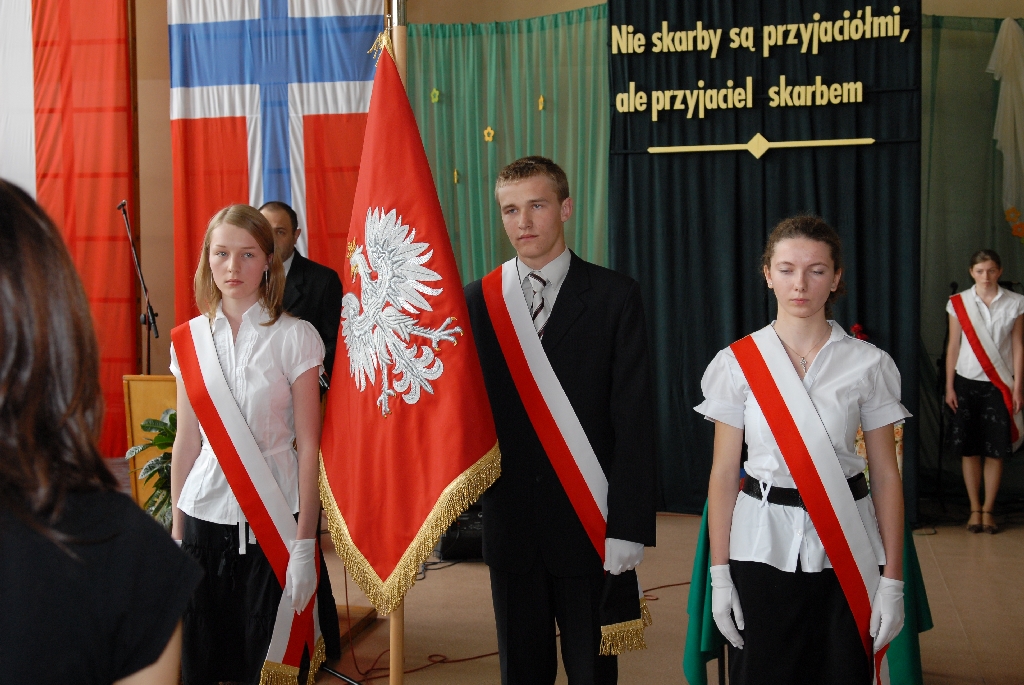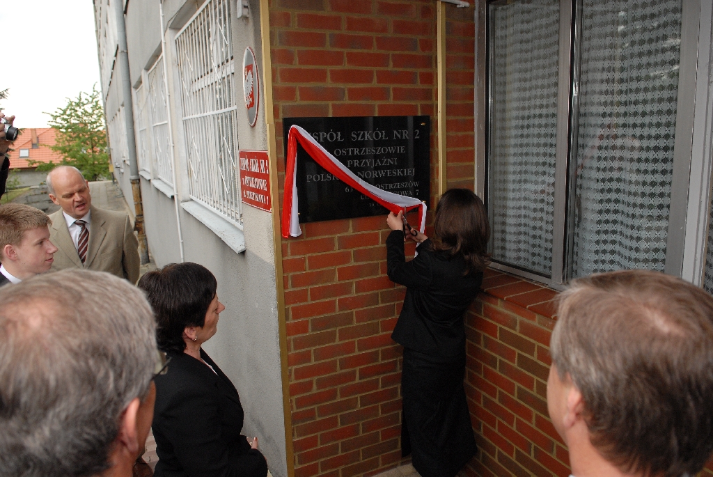 Rozpoczął się dość długi proces wyłaniania kandydatów poszczególnych środowisk tworzących społeczność szkolną. Ostatecznie po długich dyskusjach, w tajnym głosowaniu uczniów i nauczycieli zwyciężył patron-idea - Przyjaźń Polsko-Norweska. Od tej chwili podjęte zostały konkretne przygotowania do nadania szkole imienia w dniu 13 czerwca 2008 roku. Jednocześnie podjęto decyzję o zakupie nowego sztandaru dla szkoły, który miał być symbolem nowego etapu w życiu szkoły. Sztandar to ważny symbol w tradycji szkolnej, dlatego wiele było dyskusji nad jego plastycznym wyrazem. Ostatecznie jego widzialny obraz przedstawia herb miasta Ostrzeszowa wkomponowany w tarczę szkolną, u podstawy której powiewają dwie flagi: Polski i Norwegii, symbolizując przyjaźń obu narodów, tak bardzo obecną w historii naszego miasta. Tło ma barwy powiatowe z herbem powiatu w narożniku, co jest nawiązaniem do faktu, że to właśnie powiat jest organem prowadzącym szkołę.