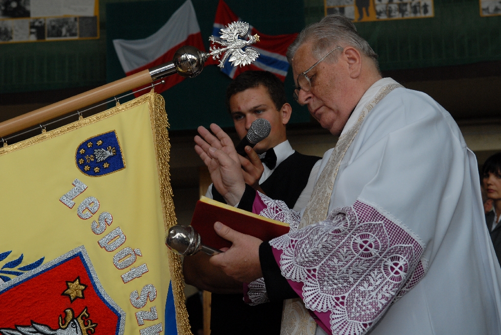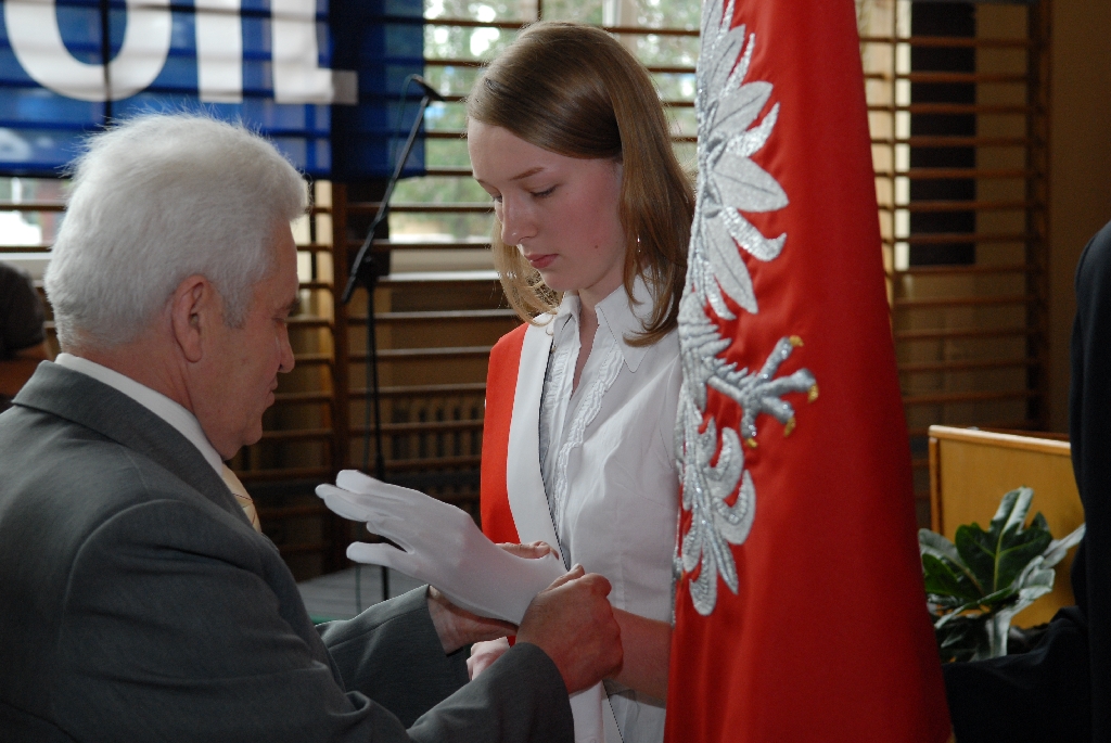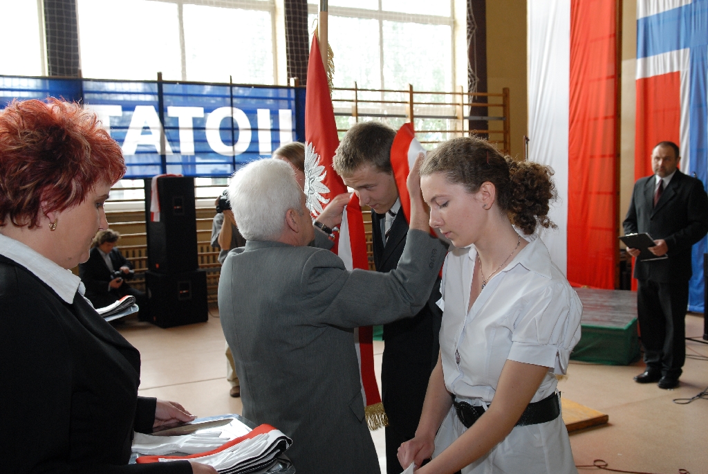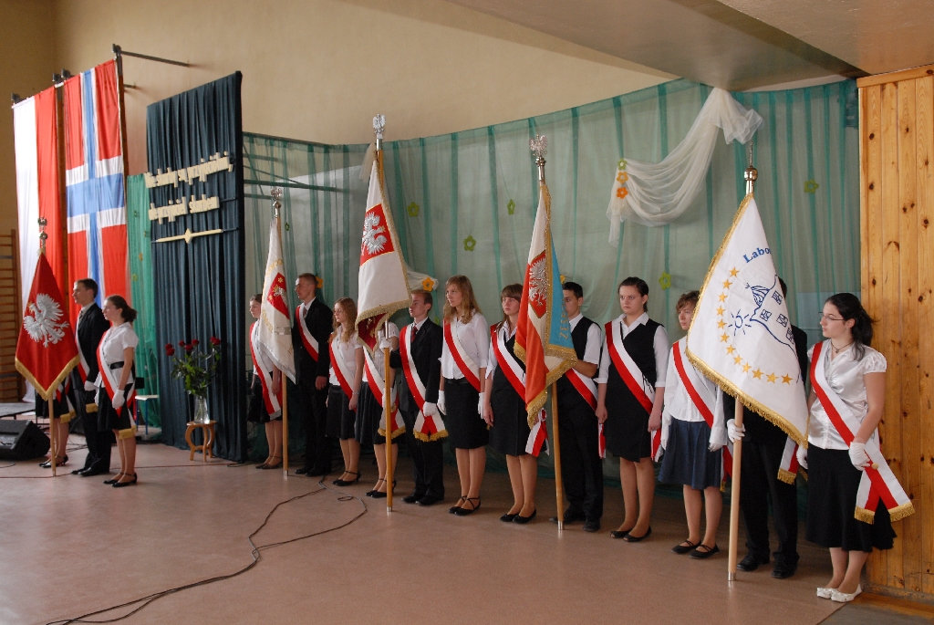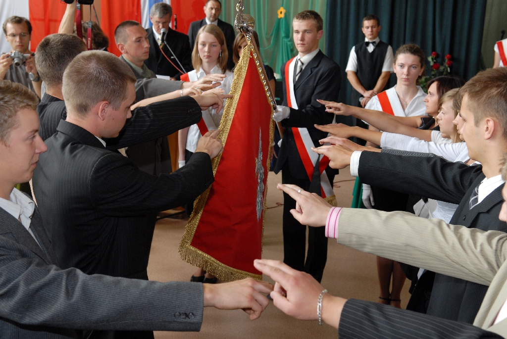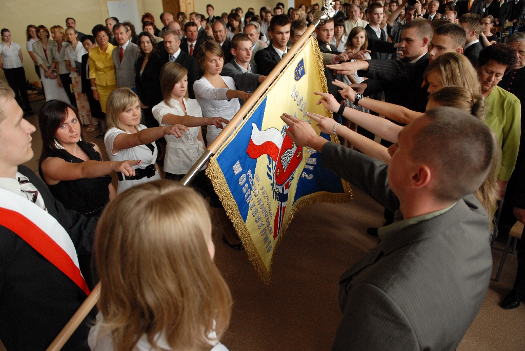 Rozpoczął się dość długi proces wyłaniania kandydatów poszczególnych środowisk tworzących społeczność szkolną. Ostatecznie po długich dyskusjach, w tajnym głosowaniu uczniów i nauczycieli zwyciężył patron-idea - Przyjaźń Polsko-Norweska. Od tej chwili podjęte zostały konkretne przygotowania do nadania szkole imienia w dniu 13 czerwca 2008 roku. Jednocześnie podjęto decyzję o zakupie nowego sztandaru dla szkoły, który miał być symbolem nowego etapu w życiu szkoły. Sztandar to ważny symbol w tradycji szkolnej, dlatego wiele było dyskusji nad jego plastycznym wyrazem. Ostatecznie jego widzialny obraz przedstawia herb miasta Ostrzeszowa wkomponowany w tarczę szkolną, u podstawy której powiewają dwie flagi: Polski i Norwegii, symbolizując przyjaźń obu narodów, tak bardzo obecną w historii naszego miasta. Tło ma barwy powiatowe z herbem powiatu w narożniku, co jest nawiązaniem do faktu, że to właśnie powiat jest organem prowadzącym szkołę.